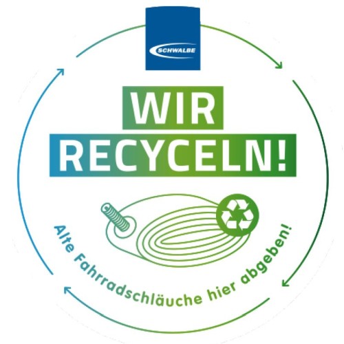 Bring uns alte Schläuche vorbei, und wir sorgen dafür, dass daraus wieder neue Schläuche hergestellt werden. Alle gesammelten Butylschläuche übergeben wir an Schwalbe. Der Hersteller führt diese zurück in sein Werk und nutzt den Rohstoff in der Produktion. Jeder neue Schwalbe Standardschlauch besteht schon heute zu rund 20 % aus recyceltem Rohstoff.